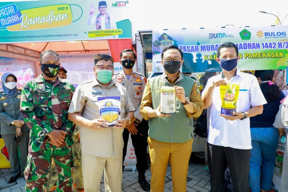 PAMEKASAN, lebur.id- Bupati Pamekasan, Madura, Jawa Timur Baddrut Tamam meresmikan pasar murah di eks RSUD Jalan Kesehatan, Senin (12/4/2021). Peresmian tersebut dihadiri anggota forkopimda, instansi terkait, mitra, dan masyarakat dengan tetap memperhatikan protokol covid-19.