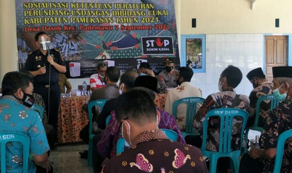 PAMEKASAN, Lebur.id – Bea Cukai Madura, Dinas Pemberdayaan Masyarakat Desa (DPMD), dan Bagian Perekonomian Sekretariat Daerah (Setda) Kabupaten Pamekasan, Jawa Timur melakukan sosialisasi tahap kedua tentang undang-undang cukai dan bahaya rokok ilegal di Balai Desa Dasuk Kecamatan Pademawu, Pamekasan, Selasa (07/09/21).