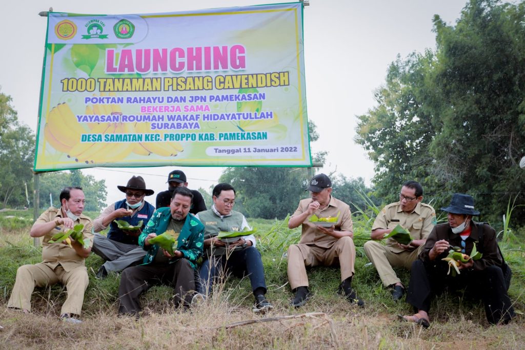 PAMEKASAN, Lebur.id– Bupati Pamekasan, Madura, Jawa Timur, Baddrut Tamam menanam 1000 pohon pisang Cavendish di Desa Samatan Kecamatan Proppo, Selasa (11/1/2022). Penanaman pisang ini terlaksana berkat kerjasama antara Poktan Rahayu dan JPN Pamekasan dengan Yayasan Rumah Wakaf Hidayatullah Surabaya.