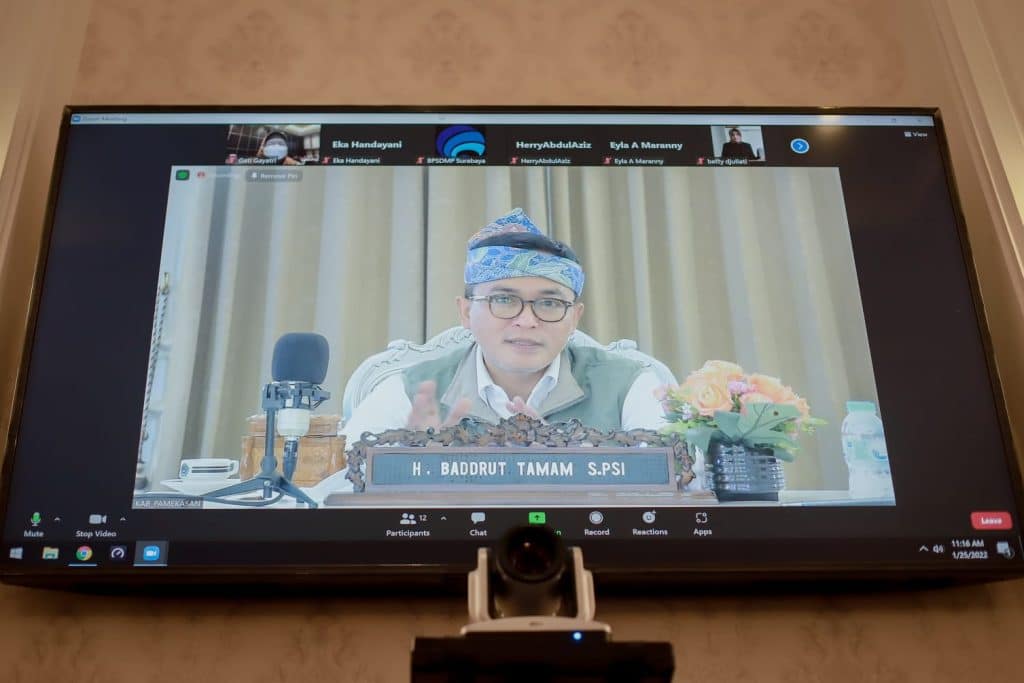 PAMEKASAN, lebur.id- Bupati Pamekasan, Madura, Jawa Timur, Baddrut Tamam menggelar rapat virtual bersama Balai Pengembangan Sumber Daya Manusia dan Penelitian Komunikasi dan Informatika (BPSDMP Kominfo) Surabaya, Selasa (25/1/2022). Rapat terbatas itu dalam rangka membahas program 10 ribu digital entrepreneurship yang akan dilaksanakan tahun 2022. Program tersebut merupakan kerjasama antara BPSDMP Surabaya dengan Pemkab Pamekasan.