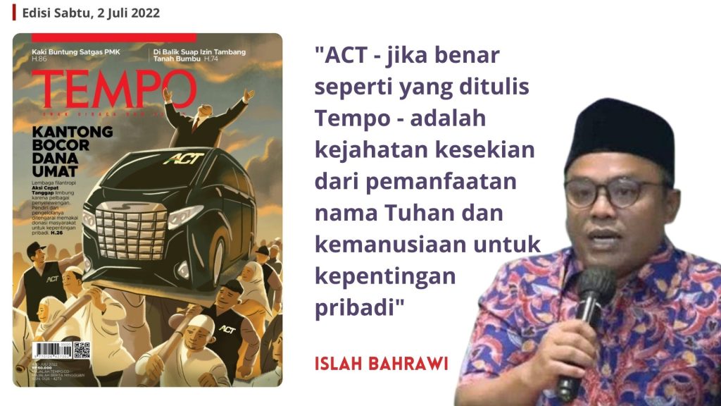 JAKARTA, Lebur.ID- Berita berjudul “Kantong Bocor Dana Umat” yang diterbitkan oleh Majalah Tempo, edisi 4-10 Juli 2022 mendapat banyak tanggapan. Salah satunya dari Direktur Jaringan Moderat Indonesia, Islah Bahrawi. Pria berdarah Madura itu menyebut bahwa, jika berita tentang dugaan korupsi dana umat yang dilakukan oleh Aksi Cepat Tanggap (ACT) sebagaimana diberitakan Majalah Tempo itu benar adanya, maka hal itu termasuk kejahatan dari pemanfaatan nama Tuhan.