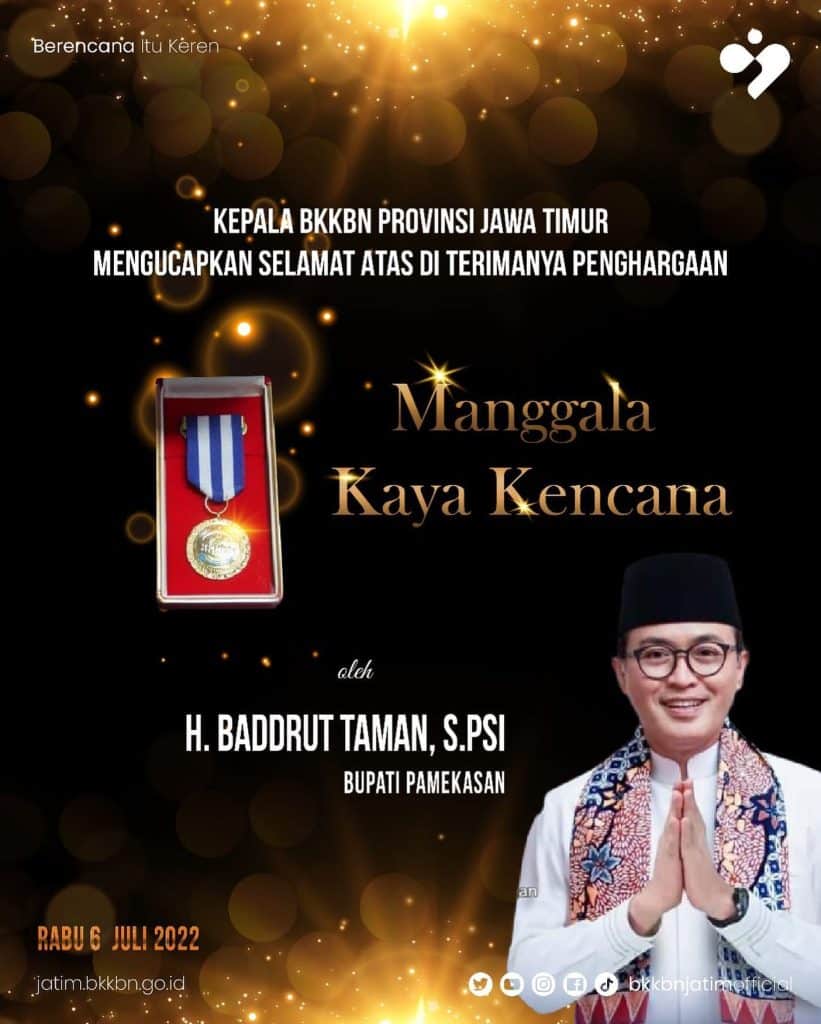 “Kepala BKKBN Provinsi Jawa Timur mengucapkan selamat atas diterimanya penghargaan Manggala Karya Kencana oleh H. Baddrut Tamam, S.Psi., Bupati Pamekasan,” tulis ucapan tersebut sebagaimana tersebar di banyak group whatsapp. (isa)