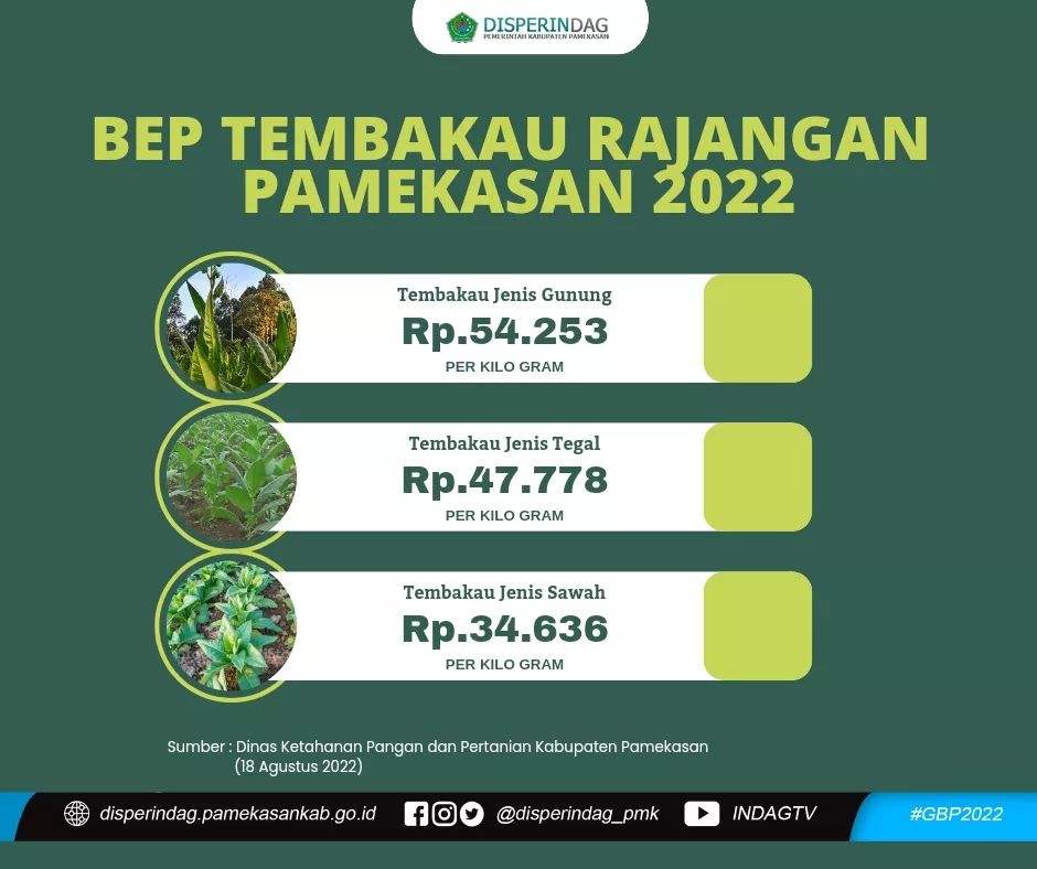 Dia menjelaskan, tahun ini pihaknya membagi BEP tembakau dalam tiga kategori, pertama tembakau sawah Rp 34.636 per kilogram, tembakau tegal Rp 43.779 per kilogram, dan tembakau gunung yang di angka Rp 54.235 per kilogram.