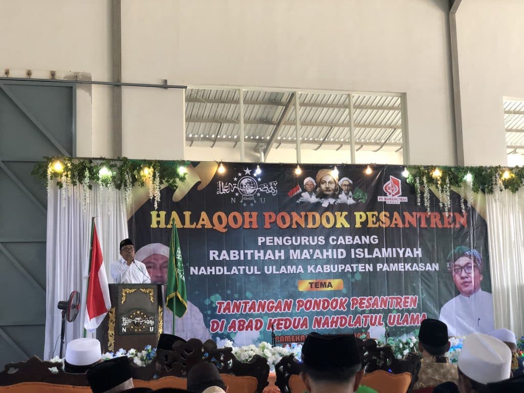 PAMEKASAN, Lebur.id- Rabithah Ma’ahid Islamiyah (RMI) Pimpinan Cabang Nahdlatul Ulama (PCNU) Pamekasan menggelar halaqoh pondok pesantren (ponpes) di gudang induk PT Bawang Mas Group, Blumbungan, Larangan, Pamekasan, Minggu (21/5/2023). Kegiatan yang diikuti delegasi ponpes se-Pamekasan itu bertajuk “Tantangan Pondok Pesantren di Abad Kedua NU”.