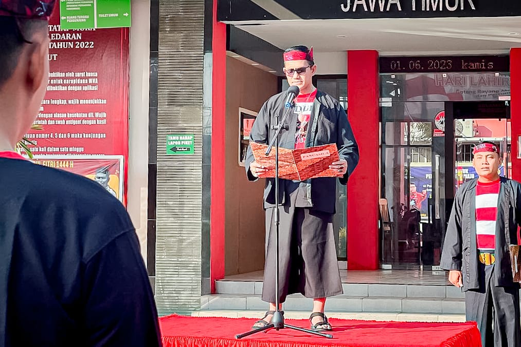 “Pancasila sebagai dasar dan ideologi negara merupakan meja statis yang menyatukan berbagai keragaman yang ada, sekaligus sebagai “bintang penuntun” dinamis yang memandu kehidupan bangsa agar sesuai dengan cita-cita pendirian negara, mewujudkan masyarakat Indonesia yang merdeka, bersatu, berdaulat, adil dan makmur,” ujar Eddy Junaedi ketika membacakan amanat upacara oleh Presiden RI, Joko Widodo.
