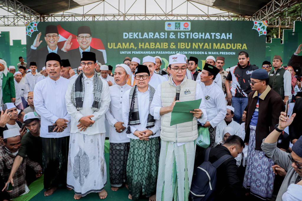 Bahkan, pasangan Anies Baswedan dan Gus Muhaimin yang hadir langsung pada kampanye akbar bertajuk Deklarasi dan Istigasah bersama Para Ulama’, Habaib, dan Ibu Nyai se-Madura itu juga dengan khidmat menyimak proses deklarasi dukungan tersebut.