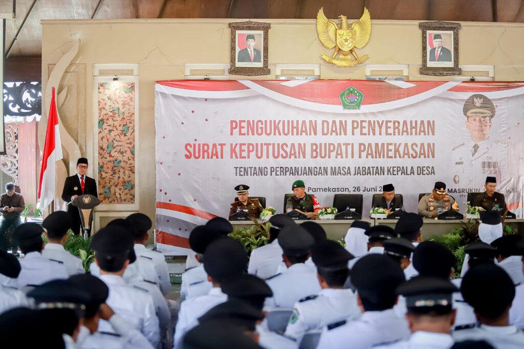 PAMEKASAN, Lebur.id – Penjabat (Pj) Bupati Pamekasan, Jawa Timur, Masrukin, resmi mengukuhkan sekaligus memberikan Surat Keputusan (SK) perpanjangan masa jabatan kepada 159 kepala desa (kades) setempat di Mandhapa Aghung Ronggosukowati, Rabu (26/6/2024).