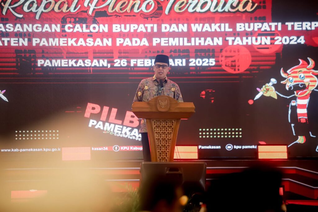 PAMEKASAN, Lebur.id – Komisi Pemilihan Umum (KPU) Kabupaten Pamekasan, Madura, Jawa Timur menggelar rapat pleno terbuka penetapan calon bupati dan calon wakil bupati terpilih di Ballroom Odaita Hotel Jalan Raya Sumenep-Pamekasan, Rabu (26/2/2025) malam.