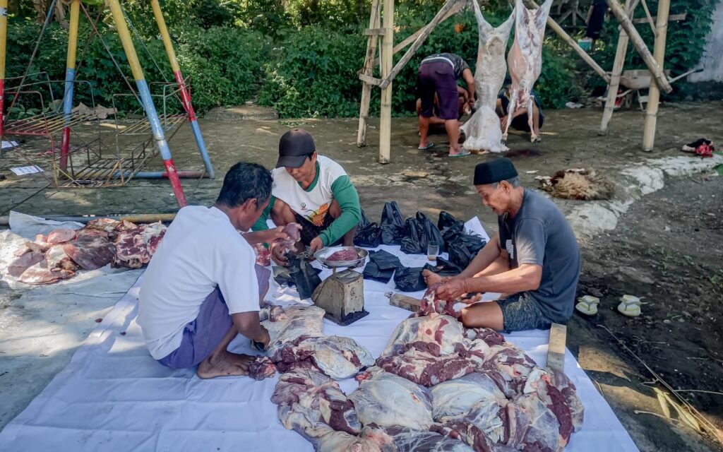 Setelah disembelih, dipotong, ditimbang, dan dikemas satu-persatu secara rata, daging hewan kurban pun mulai didistribusikan ratusan warga sekitar pesantren, dewan guru, para santri, wali santri, serta anak yatim.